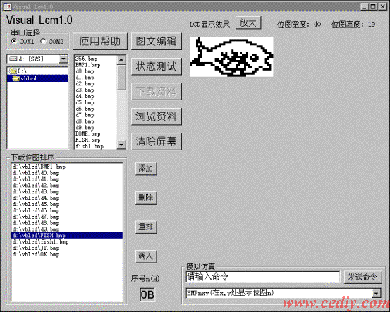 在主画面的“发送命令”左边的命令输入框中输入正确的命令后点击“发送命令”,此时LCD屏上会有相应的显示动作,若在调试过程中发现要修改某位图时可以用“图文编辑”